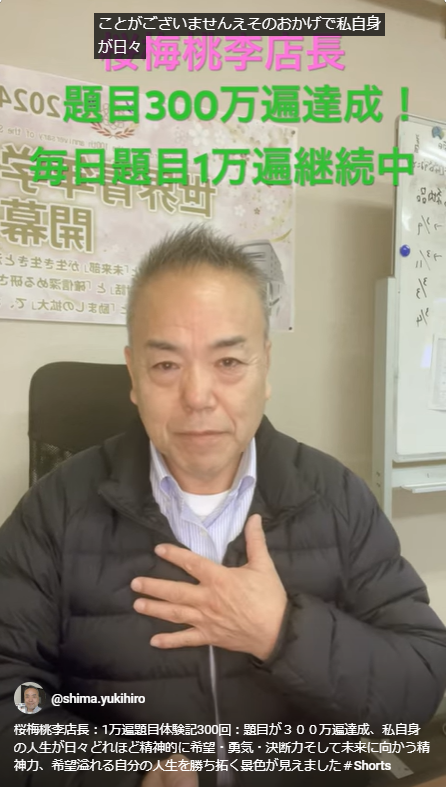 桜梅桃李店長:1万遍題目体験記300回:題目が300万遍達成、私自身の人生が日々どれほど精神的に希望・勇気・決断力そして未来に向かう精神力、希望溢れる自分の人生を勝ち拓く景色が見えました 情熱店長ブログ 2024.03.02 今日はおかげさまで昨年の4月23日から続けています題目が300万遍達成することが出来ました!誠にありがとうございます。 人生の中でこれほど題目を継続してきたことは有りません。 そのおかげで、私自身の人生が日々どれほど精神的に希望・勇気・決断力そして未来に向かう精神力、希望溢れる自分の人生を勝ち拓くそういう景色が見えています。皆様継続です! « 前のブログへ ブログ一覧 次のブログへ »