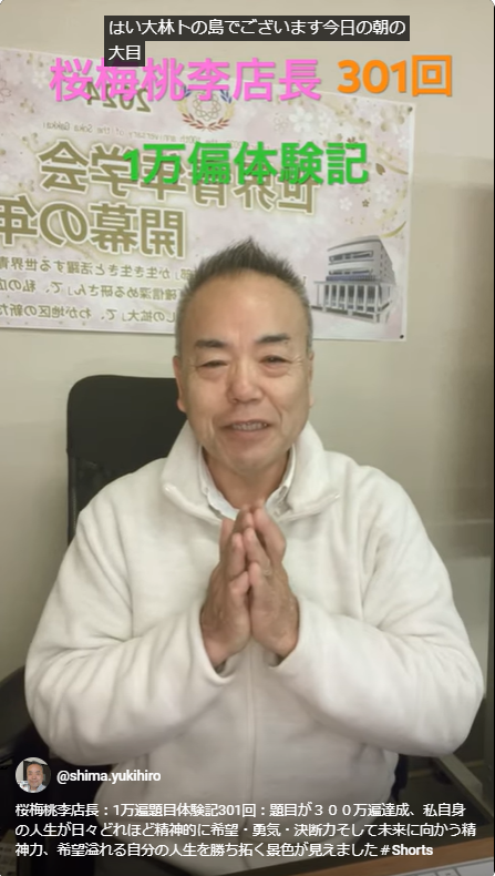 桜梅桃李店長:1万遍題目体験記301回:昨日は1万遍題も300万遍と言う一つの大きな山を乗り越え、また次の山に向けてスタートする今日3月3日はひな祭りですね、おめでとうございます! 情熱店長ブログ 2024.03.03 昨日は1万遍題も300万遍と言う一つの大きな山を乗り越え、また次の山に向けてスタートする今日3月3日はひな祭りですね、お節句でございます。 おめでとうございます!今日も軽やかにそしてですね、自分自身ができる最大限の事をさせて頂こうと思っております。 午前中はしっかりと勉強して午後から仕事をして、そして家庭訪問とお見舞いに行けるかな??と言うそんな感じです。毎日価値創造し、そして悠然と挑戦していきたいと思っています! « 前のブログへ ブログ一覧 次のブログへ »