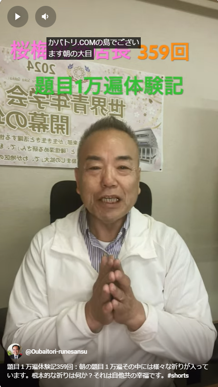 題目1万遍体験記359回:朝の題目1万遍その中には様々な祈りが入っています。根本的な祈りは何か?それは自他共の幸福です 情熱店長ブログ 2024.04.30 今日もお元気でしょうか!朝の題目1万遍その中には様々な祈りが入っています。根本的な祈りは何か?それは自他共の幸福という事になります。 広宣流布と言っても足元から、縁する方々と幸せにそしてお互いに大変な時には心使いをしながら、そして話を聞いてあげる、そしてそばにいてあげる。それは心で有ったり会話で有ったり、そういう事だと思っております。 « 前のブログへ ブログ一覧 次のブログへ »
