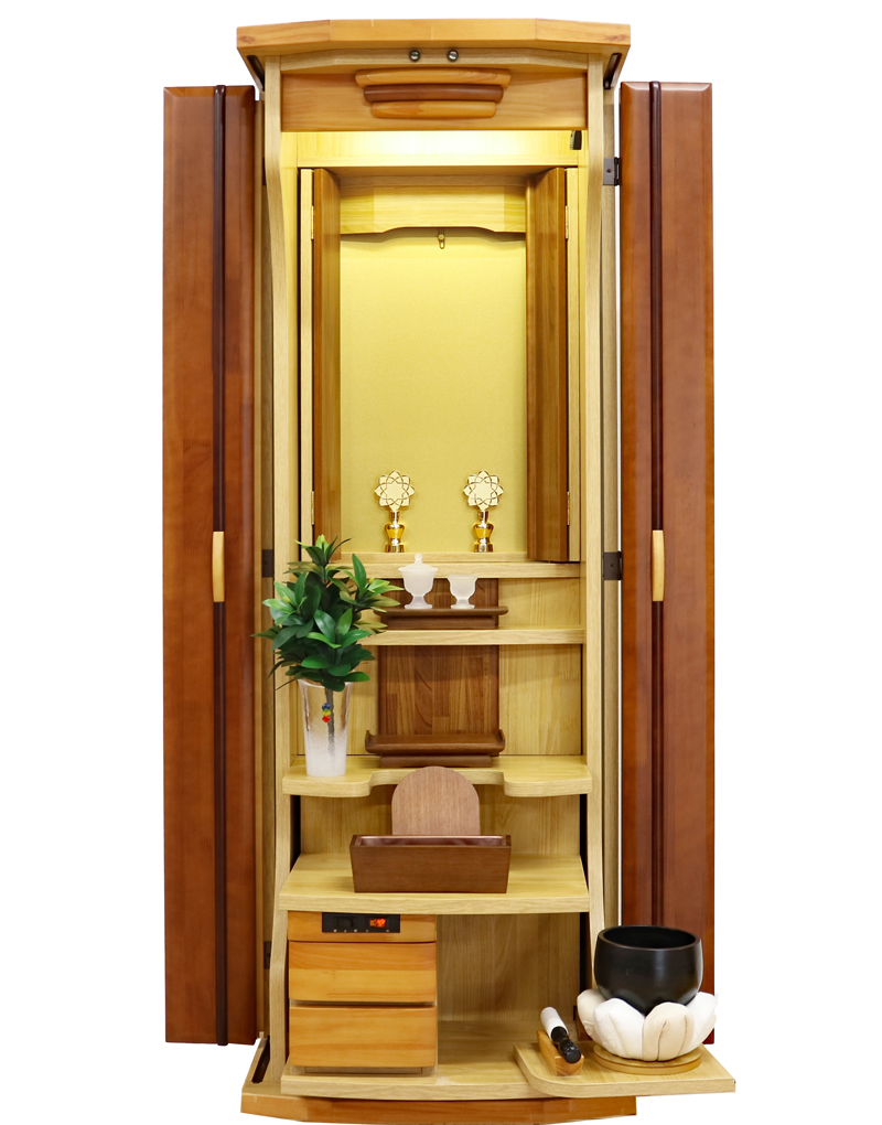 収納リン台に擦り傷が見られますのでB級仏壇として格安にてご提供させていただきます。ダーク色とライト色のツートンのコンビネーション色です。今までのお仏壇のデザインではなかった、オシャレな雰囲気漂うデザインに仕上がっております。押し込み式大戸ですので、押し込むことで斜めからもご本尊様を拝すことができます。