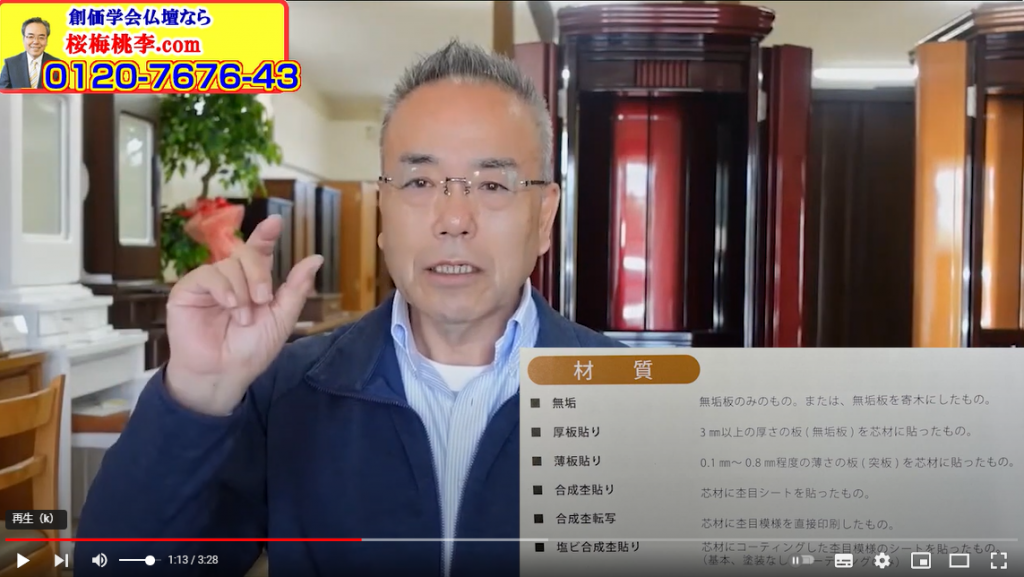 30年、40年前の仏壇の価格は100万、200万が当たり前の時代でもありました。日本経済の流れもそうですが時代の変化、世界の情勢によってすべて影響される時代となったのです。現在では30万円の仏壇でも高額商品の時代に入っています。(材質資料は仏壇カタログ引用)