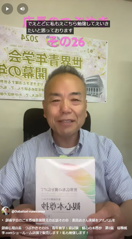 創価仏壇店長:つぶやきその25:青年教学1級試験:観心の本尊抄 第2版 桜梅桃李.comショールーム店頭で販売します!私も勉強します! お知らせ 2024.05.26 年教学1級試験:観心の本尊抄 第2版 桜梅桃李.comショールーム店頭で販売します!私も勉強します! 日蓮大聖人御書:5大部の中の重書です。私も受験するつもりで青年として勉強してまいります。佐渡御書まらためて6月大白蓮華にて、しっかり勉強していきます。信行学で信心強化・深化していきます。 « 前のブログへ ブログ一覧 次のブログへ »