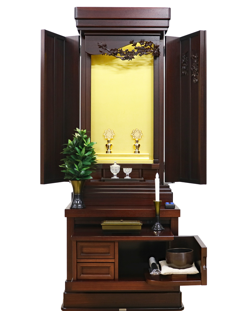 ソノクリン(紫檀またはローズウッド)の無垢板をふんだんに使用して、桜模様の彫りを施し優しい色味に仕上がっております。電動扉は設置場所に応じて扉の開き方が大開、中開きと2段階に調節することができます。お厨子内は本金箔仕様でご本尊様をより荘厳することができます。仏壇製造で有名な徳島県産のお仏壇です。