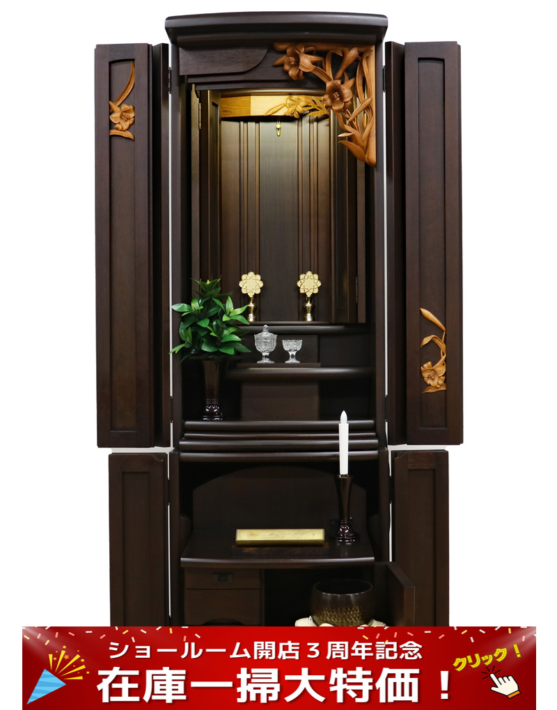 金剛堂さんの「521ニヤトー白ゆり」の中古仏壇です。ニヤトー材をふんだんに使用した至高の商品です。大戸・欄間に施された洗練された白ゆりの彫刻は厚みがあり、圧巻の一言です。扉が2箇所に分けられていますので、厨子だけ開閉ができスマートにご安置できます。(表示価格はお値引き後の大特価です)