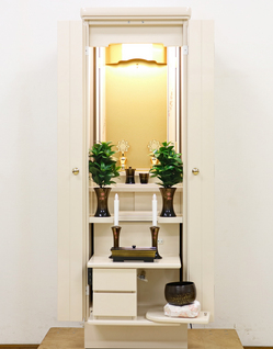 使用年数がわずか4年、LED照明付きで、現在当店にて、新品仏具付価格288,000円で販売中の「フロート パールホワイト」の中古仏壇です。展示品レベルのきれいな仏壇ですのでお勧めです!