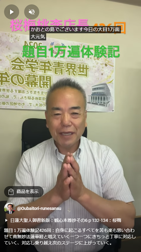 題目1万遍体験記426回:自身に起こるすべてを苦も楽も思い合わせて南無妙法蓮華経と唱えていく一つ一つにきちっと丁寧に対応していく、対応し乗り越え次のステージに上がっていく。 情熱店長ブログ 2024.07.08 酷暑・体調の調整など様々な目の前に起きている課題が有ります。すべて苦も楽も思い合わせて南無妙法蓮華経と唱えていく。 そして自分自身が自分の仏界を湧現していきながら、その一つ一つにきちっと丁寧に対応していく、対応し乗り越えてく、そしてまた次のステージに上がっていく。この連続が宿命転換であり人間革命のドラマであると自分の実体験を日々実感しています。 « 前のブログへ ブログ一覧 次のブログへ »