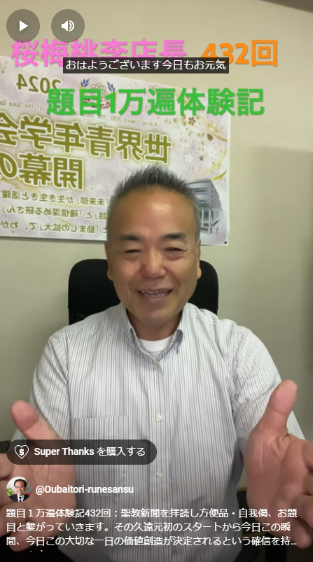 題目1万遍体験記432回:聖教新聞を拝読し方便品・自我偈、お題目と繋がっていきます。その久遠元初のスタートから今日この瞬間、今日この大切な一日の価値創造が決定されるという確信を持っています。 情熱店長ブログ 2024.07.14 私は勤行・唱題の前に聖教新聞を拝読しています。全国・全世界のSGIメンバーが戦い!体験、さらに池田先生のご指導もございます。 そのすべてを毎日、毎日拝読させていただき清々しい気持ちから方便品・自我偈、お題目と繋がっていきます。その久遠元初のスタートから今日この瞬間、今日この大切な一日の価値創造が決定されるという確信を持っています。 « 前のブログへ ブログ一覧 次のブログへ »