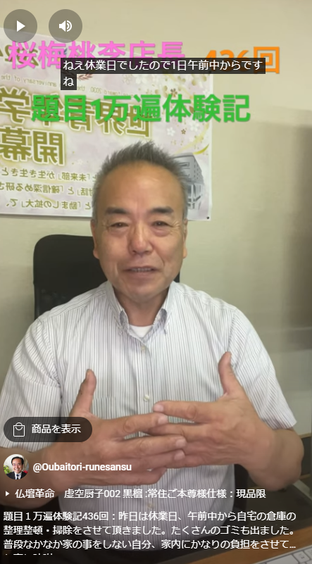 題目1万遍体験記436回:昨日は休業日、午前中から自宅の倉庫の整理整頓・掃除をさせて頂きました。たくさんのゴミも出ました。普段なかなか家の事をしない自分、家内にかなりの負担をさせていた事に陳謝 情熱店長ブログ 2024.07.18 昨日は休業日、午前中から自宅の倉庫の整理整頓・掃除をさせて頂きました。たくさんのゴミも出ました。普段なかなか家の事をしない自分、家内にかなりの負担をさせていた事に陳謝、汗だくで作業し今日の朝の分別ゴミに車で出してきました。心から奥様に感謝し、今後は自分も積極的にかかわる事にしてまいります。 « 前のブログへ ブログ一覧 次のブログへ »