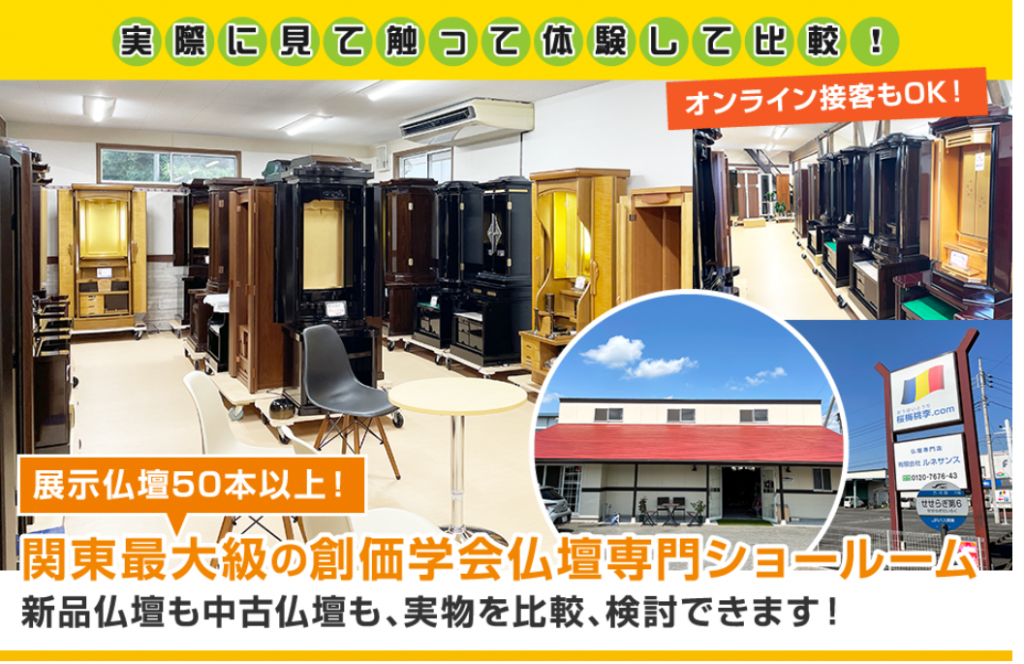 新品・中古仏壇・修理・中古買取り・仏壇処分サービスを行っています。 創価学会仏壇に関する様々な疑問、問題の解決など、全国の創価同志の皆様にYouTube動画を使い適切な情報をご提供していきたいと思ています。2021年5月3日圏央道五霞インターより15分の至近に桜梅桃李.comショールームを開店しました。関東6県の中でも、創価仏壇専門店として店舗面積・仏壇展示数+駐車場の広さに自信があります。ゆったりと創価仏壇を比較検討するにふさわしい移動式展示を行っていますので是非ともご来店くださいませ。