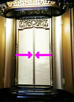 ご本尊様のご安置されている場所は「お厨子」と呼ばれています。今回のお仏壇はその扉は金色塗装で両方にオープン開きされています。その中にスライド式(ふすまを開く感じ)両方に扉が開きます。ここが故障されていますので、両手で矢印のところから左右に少し押し気味で開いて頂きました。ちょっと力も必要ですが、壊れたりしませんので安心してください